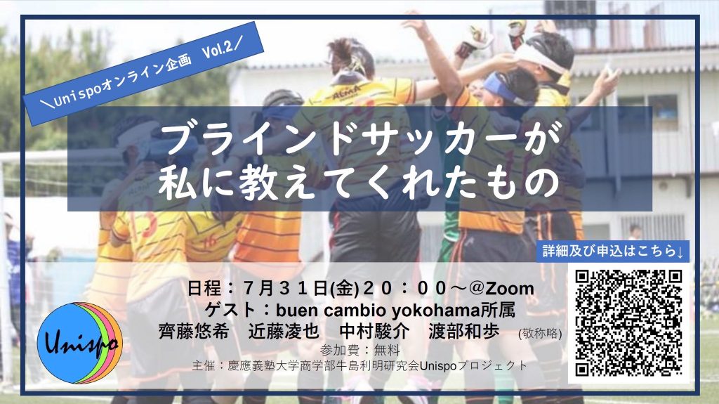 神奈川県唯一のブラインドサッカーチームbuen cambio yokohama(活動拠点:横浜、代表:鎌野 暁斗)は、慶應義塾大学商学部牛島利明研究会プロジェクトUnispoオンライン企画「ブラインドサッカーが私に教えてくれたもの」にゲスト出演いたします。「誰もが楽しめる社会」の実現を目指すという観点から、ブラインドサッカーを切り口にお話しさせていただきます。以下申込フォームよりご応募の上、是非ご参加ください。